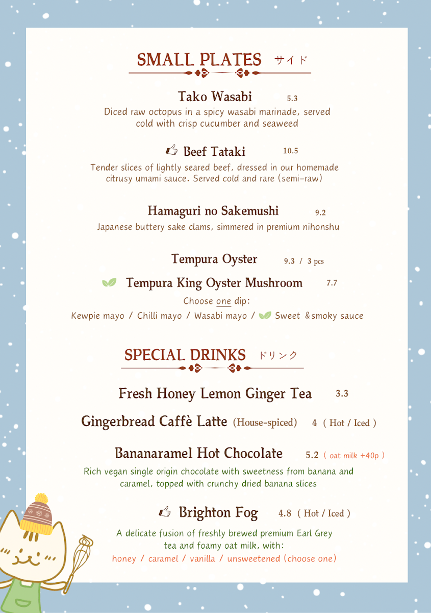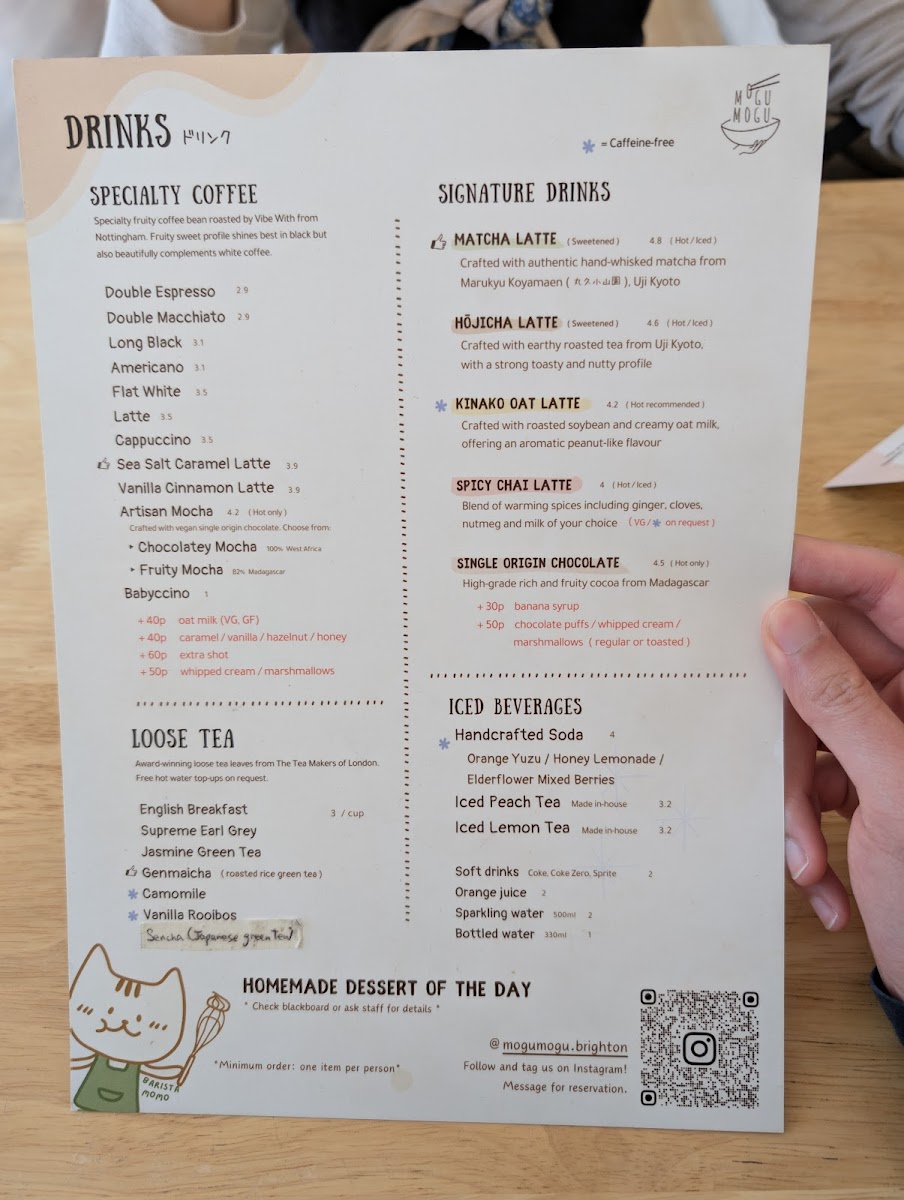 The drink selection includes a range of specialty coffees and traditional Japanese teas, like Matcha Latte and Jasmine Green Tea, which fit naturally with the relaxed and welcoming environment. These are paired beautifully with delicate desserts such as Raspberry Cat Pudding and Hojicha Cheesecake—treats that provide a quiet moment of sweetness without overwhelm.